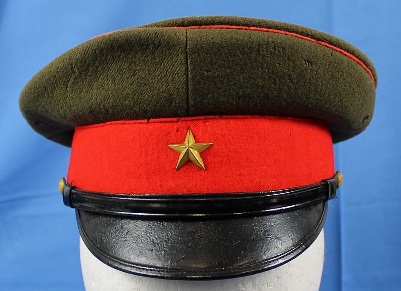 The olive green wool visor cap has a red wool cap band and a red piped crown. The surface of the visor exhibits age crazing. The leather chin strap is present, retained by gilt officer cherry blossom buttons. The wool body, cap band, and piping show scattered small bites and holes, none being particularly distracting. The top surface of the cap has some relatively subtle tracking. The interior leather sweatband is intact, as is the cap lining. The lining bears handwritten kanji. The cap retains a very good saddle shape and it makes a fine appearance.