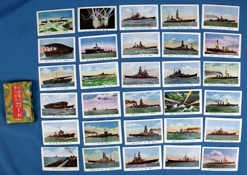 The set is comprised of 30 color cigarette cards, each approximately 1-3/4 inches by 2-3/4 inches. Many of the cards have a faint stamp on the reverse. The cards depict a variety of Japanese Navy warships and they are contained within their original box, which lacks the closure flap.