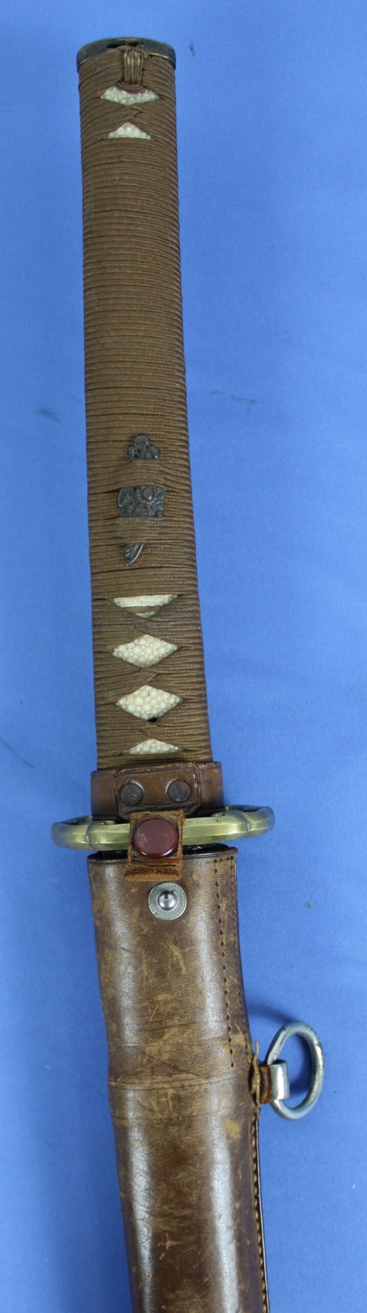 The sword with an old blade has an overall length in the scabbard of approximately 34 inches, with a blade length of approximately 22 inches. The blade shows scratches and mossy spots, particularly on both sides of the lower areas of the blade, but the blade is without nicks, chips, or active rust. The tang exhibits rust and it is unsigned. The grip is wrapped in the traditional fashion with dark brown fabric. Beneath the wrapping on both sides are figural menuki. The ray skin grip covering the fabric wrapping has a crack on one side. The tsuba guard is a solid style with relief cherry blossoms, while having an opening through which a cloure strap connects from the ferrule to the snap on top of the leather scabbard cover. The pommel cap has a relief decorative design. The leather combat scabbard cover shows scuffs and abrasions but it is complete and intact.