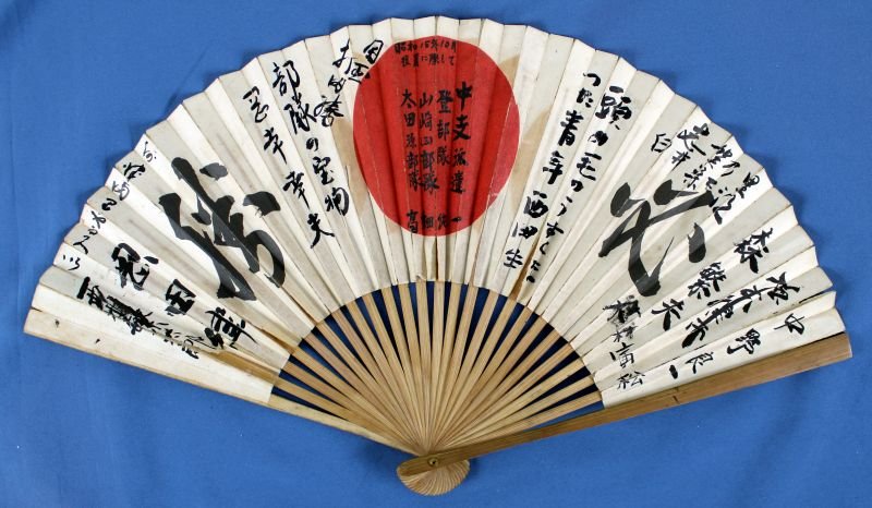 The paper fan is double sided and it is approximately 15-1/2 inches wide when open. The fan exhibits some spots and age toning, but it is complete and intact. Overall very good condition.