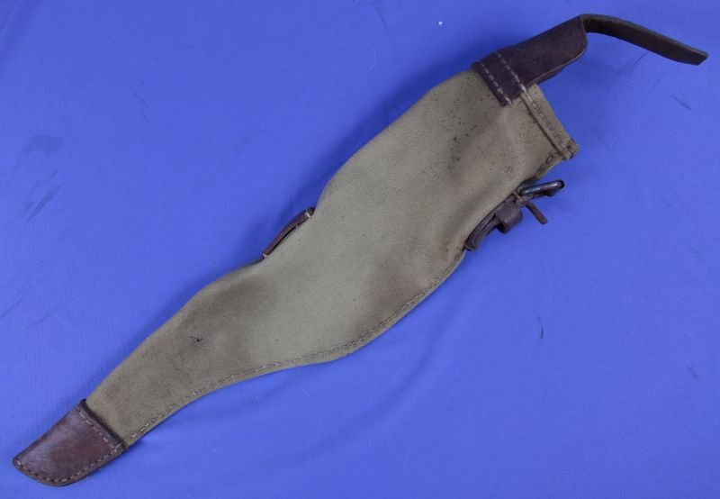 The web pouch is approximately 14-1/2 inches long. The leather cover is somewhat stiff but it is intact. The buckle fastener shows rust consistent with use in a tropical environment.