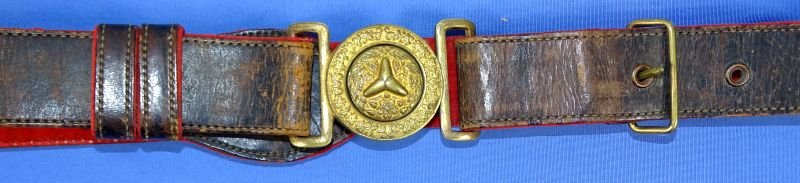 The leather belt has a two piece officer buckle and it is fully lined in red wool. The belt is approximately 34 inches, adjustable to a shorter length. The leather shows age and crazing, but it is complete. The interior wool lining shows wear and scattered holes. The buckle exhibits wear and age toning of the gilt finish. Overall good used condition.