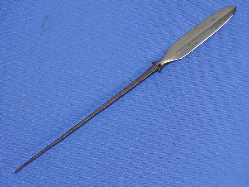 Approximately 8 inches long. The arrowhead itself is generally bright, while the shaft shows some wear and surface rust.