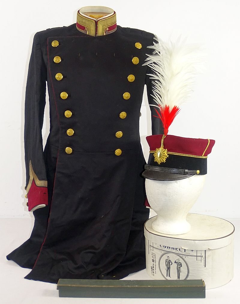 The uniform is comprised of the full dress tunic and the full dress cap, together with the cap box and the dress plume that is contained within its protective tube and box. The tunic was tailored from a high quality wool with bullion embroidery ornamentation. The interior of the cap bears embroidered kanji with the officer's name of 'Uehara'. The upper center of the tunic has four widely spaced thread loops for the wear of a substantial ribbon or medal bar. Buttons on the tail are cover with storage paper. The interior of the tunic collar exhibits the label of the Tokyo tailor that fashioned the uniform. The white celluloid inserts remain in place inside of the collar and the cuffs. There are no shoulder knots. The uniform shows some small scattered holes to the wool cuffs, the tunic piping, and to the top of the cap, however the set makes a very impressive appearance.