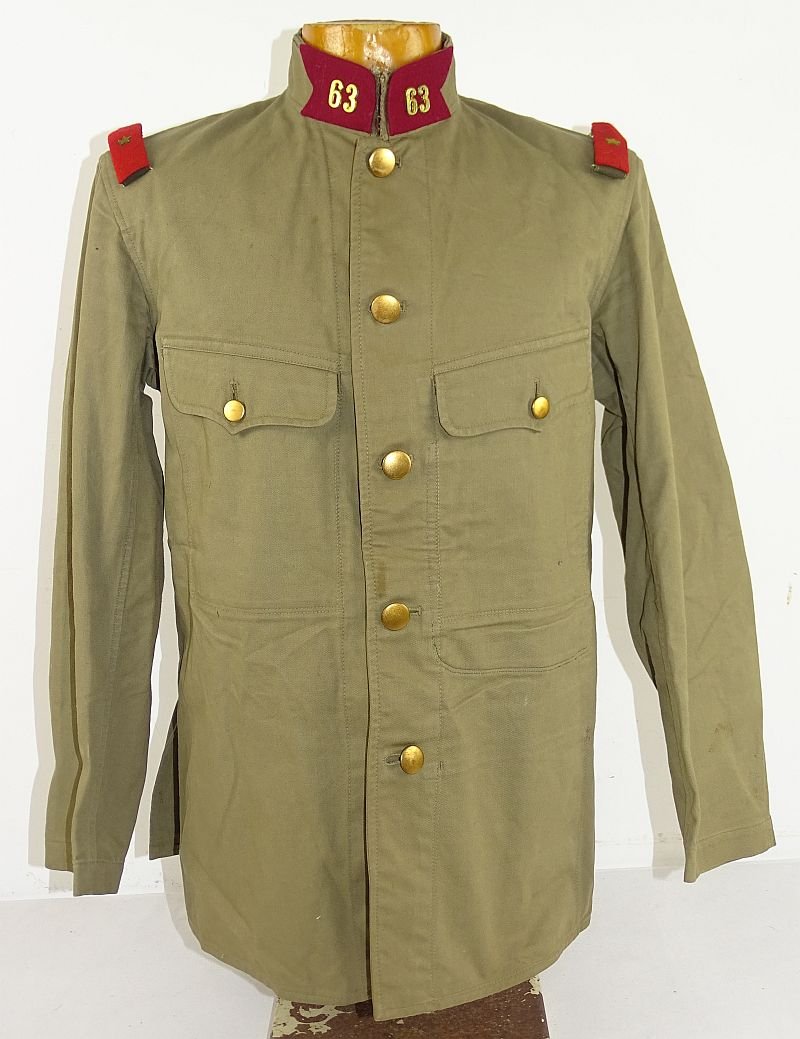 The tunic is tailored in unlined olive brown cotton. All buttons are present. The shoulders carry the rank insignia of a Private Second Class. The collars have purple tabs bearing the number '63' in metal gilt numbers, with the purple color signifying service in the Engineer Department. The tunic shows signs of actual wear, but it is without stains, damage or repairs and it is in very good condition.