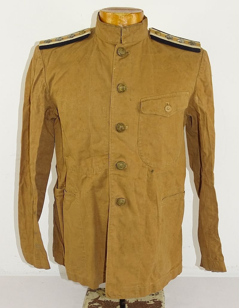 The unlined brown cotton fatigue tunic shows some spots and signs of wear, but it is without holes, repairs or damage. The tunic carries the shoulder boards of a Lieutenant of the Japanese Navy. The interior has a diamond shaped cloth bearing the name of the officer who wore the tunic. Overall very good to excellent condition.