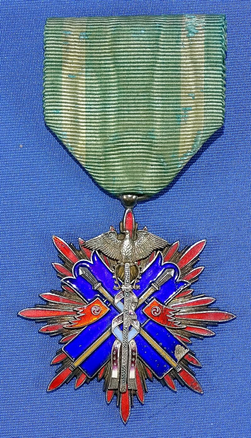 Good condition, with the enamel showing a small chip to a blue section and a few of the red rays exhibiting hairline cracks, but the Order makes a very good appearance. The ribbon shows wear, but the reverse attachment clip is intact. Overall the decoration has an uncleaned patina.