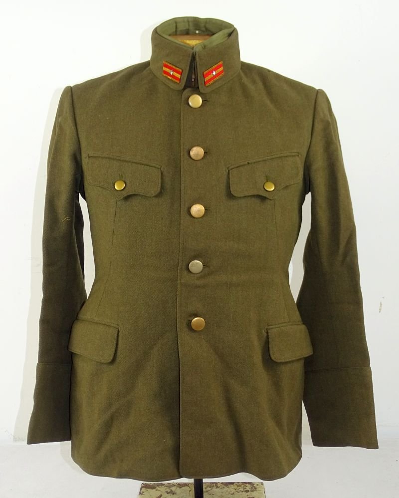 The tunic is tailored from a high quality olive wool with the collar tabs of a Second Lieutenant. The soft green collar liner is present in the tunic. Inside of the tunic is a green cloth segment that bears the embroidered kanji with the name of the officer who owned the tunic and stamps indicating that it was purchased from the Army PX at Kaikohsya. The uniform shows some very small scattered holes, not of which are distracting, and the tunic makes an excellent appearance. There is one somewhat larger hole in the lower front, but it is concealed beneath the front of the jacket when it is buttoned.