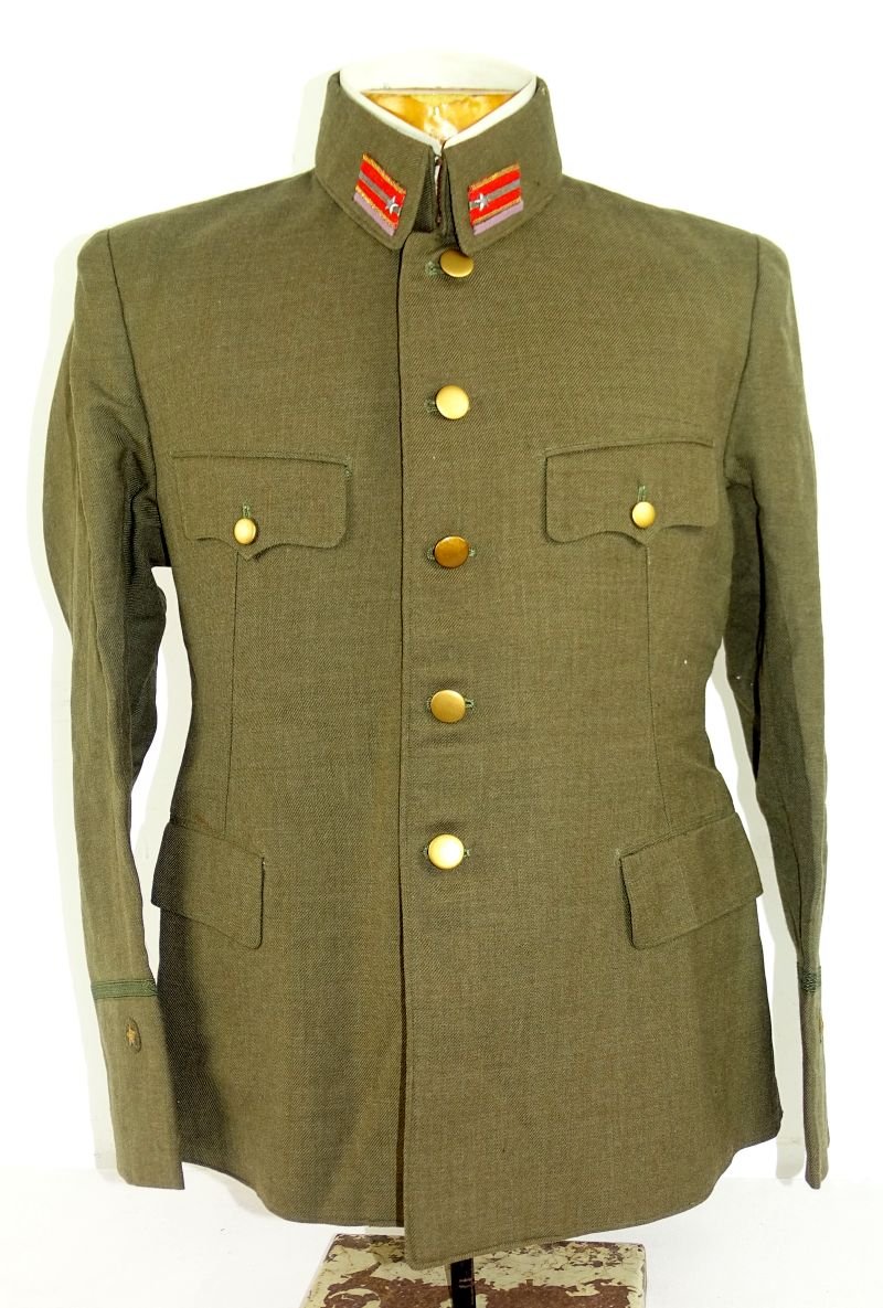 The tunic is tailored from a high quality olive wool with the collar tabs of a Second Lieutenant, below which are the lavender branch of service stripes for the army Intendance Department. Each of the sleeves carries a stripe of cuff braid and a gold bullion embroidered star. The stiff white collar liner is present in the tunic, as is the label of the tailor. The uniform shows some very small scattered holes, not of which are distracting, and the tunic makes an excellent appearance.