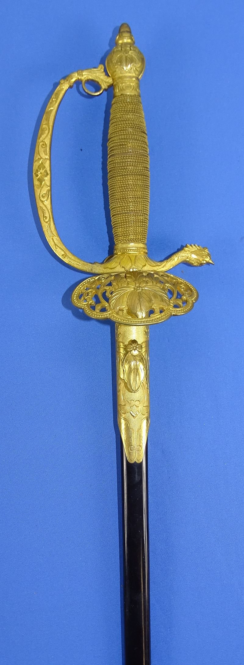 The sword has an overall length in the scabbard of approximately 31 inches, with a blade length of approximately 23 inches. The decorated etched blade is quite bright. The guard, hit, and scabbard fittings all show a fine toning of the fire gilt finish. On the reverse guard is a small silver family crest of the owner of the sword. The gold wire wrapping of the grip has loosened a bit with age but it is intact. The leather scabbard shows a fine polish and it is without cracks or damage. Overall a scarce Japanese sword that is in exceptional condition, making a very impressive appearance.