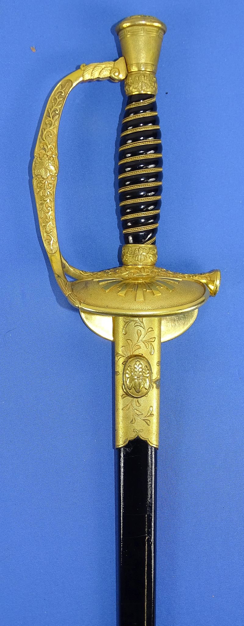 The sword has an overall length in the scabbard of approximately 31 inches, with a blade length of approximately 23-1/2 inches. The etched blade shows dark spots on both sides where plating has been lost. The guard, hilt, and scabbard fittings all show a fine toning of the fire gilt finish. The wire wrapping of the grip remains tight. The leather scabbard shows a fine polish and it is without cracks or damage. The sword was published in a reference book on Japanese swords, and that page is included with the sword.