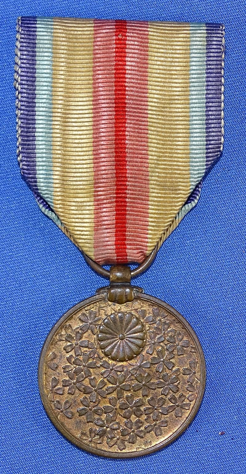 This uncommon medal was founded by Imperial Edict No. 658 of September 26, 1942, for award to those that made outstanding contributions to the war effort in China, but who were not eligible for the China Incident War Medal. The medal shows wear to the finish as well as patina. The ribbon is somewhat faded and soiled.