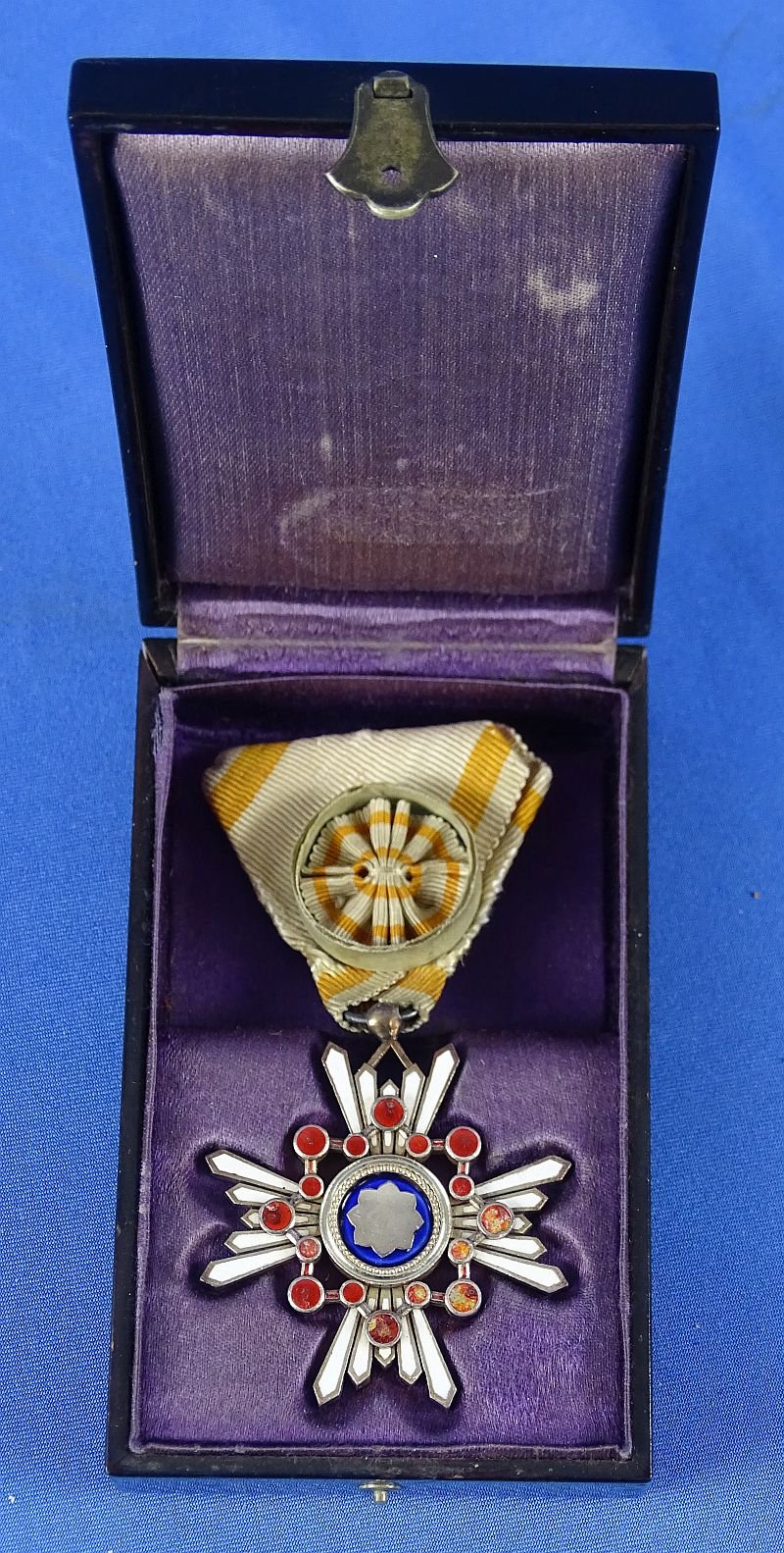 The ribbon shows some degree of age and a bit of soiling, but it is complete. The order itself is in excellent condition, with the enamel being without chips or cracks. The interior lining of the case exhibits fading. The lacquer wood case is without damage.