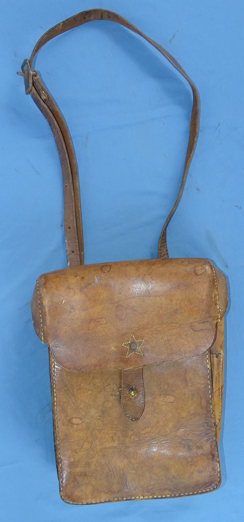 The leather case is approximately 8 inches wide by 11-1/2 inches tall by 3 inches deep, the dimensions being exclusive of the shoulder strap. The leather case shows spots and soiling from wear in the field, but it is complete and intact. The right exterior side has a pencil pocket that is torn. The upper rear of the case shows a period repair and replacement of one of the leather tabs which holds the shoulder strap attachment ring. Overall very good field used condition.