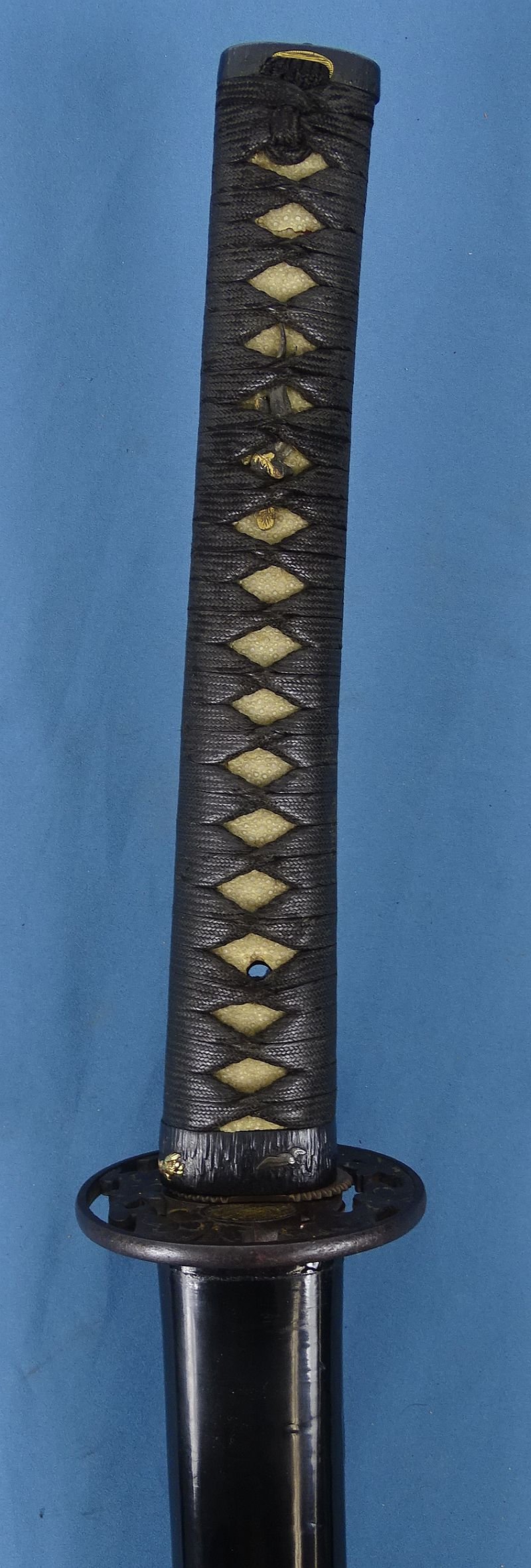 The sword has an overall length in the scabbard of approximately 37-1/2 inches, with a blade length of approximately 25 inches. The blade is very bright, while showing spots and minor scratches. The blade has a visible temper line and it is without chips, nicks, or active rust. The sword tang is signed 'Kaneshige'. His legal name was 'Morita Isamu' and he was born on November 13th 1900. He was a student of swordsmith Mizuta Seijirō Kunishige, and he signed first with 'Kanemasa' but he later changed his name in 1936 to 'Kaneshige'. He entered the Seki Guild Log on October 25 of Showa 14 (1939). The ray skin grip is wrapped in the traditional style with black fabric, beneath which are figural menuki . The tsuba guard is a decorative pierced style. The scabbard of the sword is black lacquered wood, which shows some wear and minor scuffs and with a black fabric cord ties to the scabbard. Overall excellent condition.