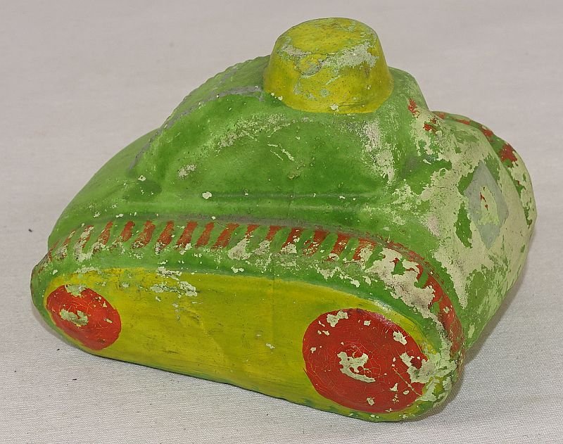 Approximately 4 inches long by 3 inches wide by 3 inches tall. The ceramic tank bank shows wear to the paint.