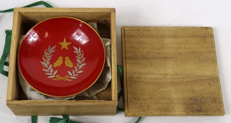 The wood lacquer sake cup has a top diameter of approximately 4-1/8 inches. The underside of the cup edge has painted kanji, as does the base of the cup. The cup is contained within its wooden box with a white silk protective cloth. The cup is in excellent condition, without chips or cracks.