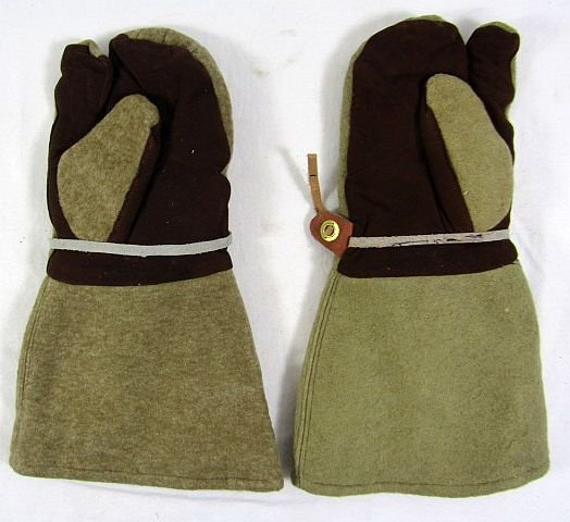 The mittens worn by Japanese troops in cold weather operations, such as those in northern Chine and the Aleutian Islands. Heavy olive brown wool mittens with suede palms and pile lining. The mittens have separate index fingers for firing a weapon. The mittens set is in mint, unused condition.