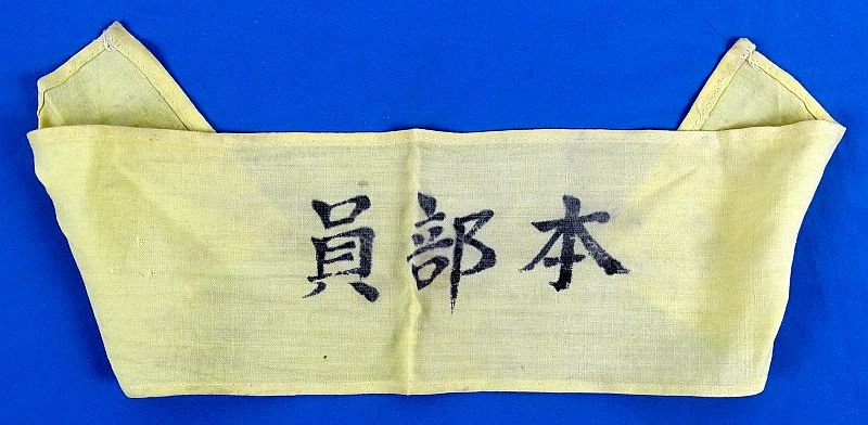 The cotton armband bears printed kanji. It shows spots and surface soiling but overall very good condition, with unsewn ends.