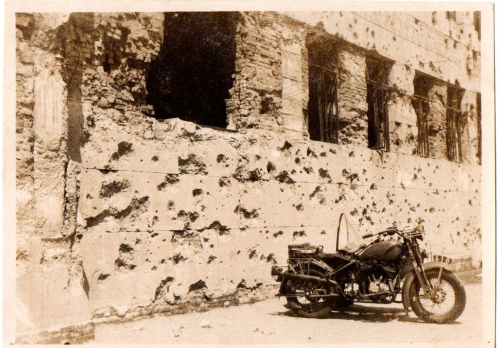 Photograph of a Japanese Navy Motorcycle at Battle Damaged Building 3″ X 4″