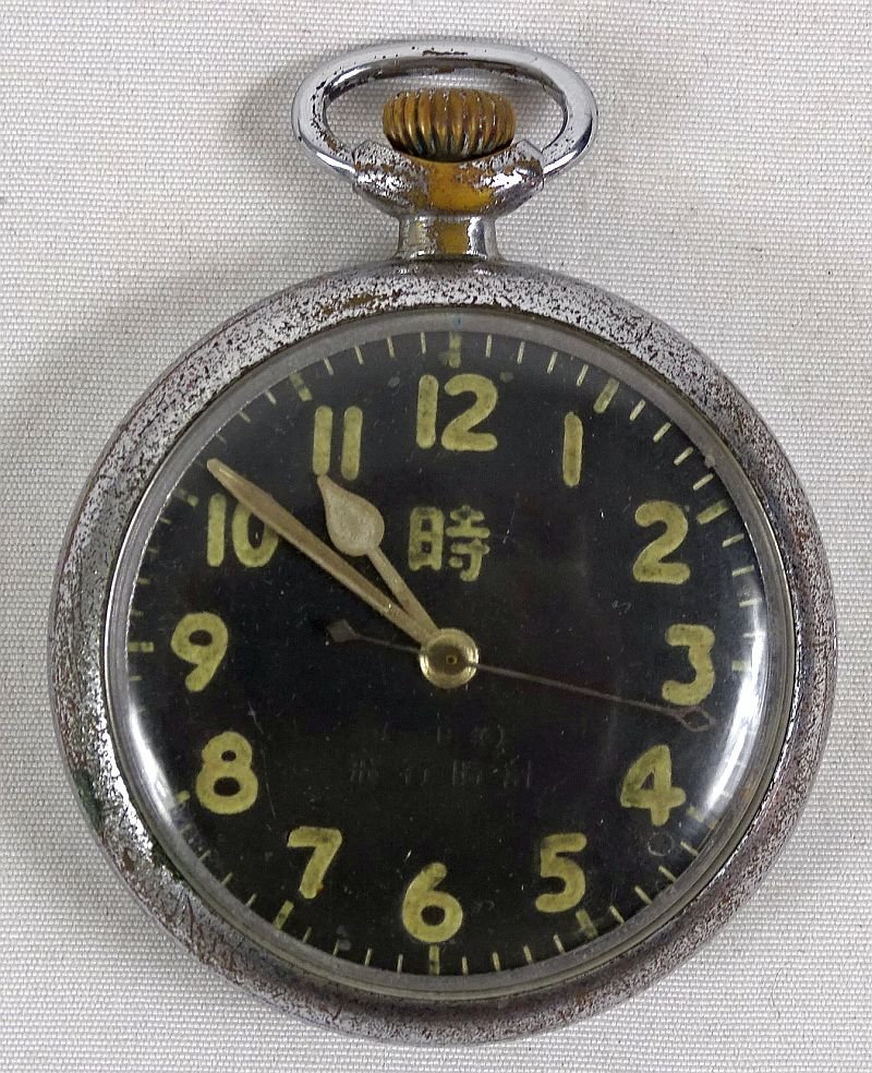 The pocket watch has a diameter of approximately 1-7/8 inches, exclusive of the stem. The face of the watch has numbers rendered in luminous paint. The watch face has impressed kanji above the number '6' which reads 'Army Aviator Watch'. The interior movement is marked by the Seikosha watch company (which would become the Seiko Company). The watch stem winds easily and the hands of the watch can be moved by the use of the stem. The watch presently runs periodically after winding, but the watch undoubtedly needs a cleaning and oiling if it were to operate continuously. The nickel case and stem show wear to the finish. Overall very good condition.