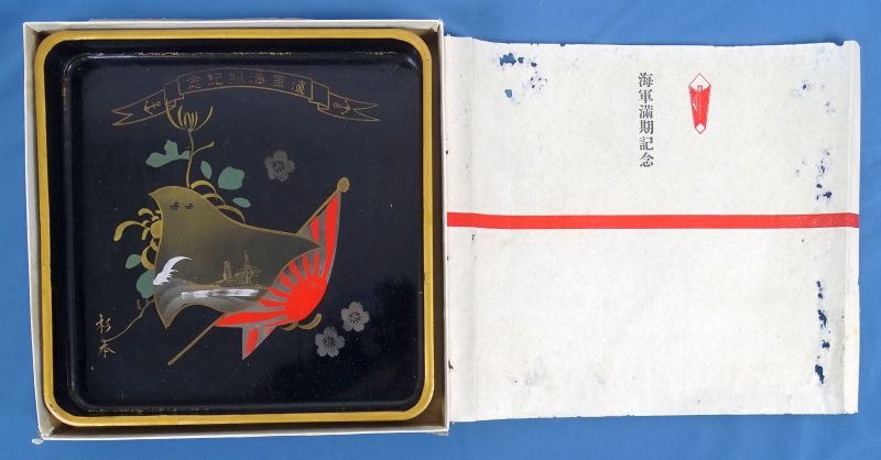 The lacquer wooden tray is approximately 8-1/2 inches by 8-1/2 inches. The tray has a Navy motif, with warship, rising sun flag, and anchors. The tray shows some small chips and the underside edges exhibit cracks to the finish, but the tray makes a very good appearance. The box shows splits to the lid.