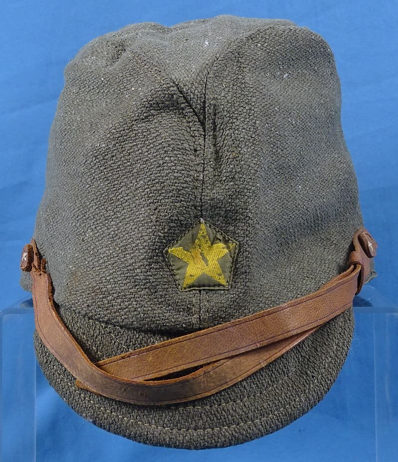 The cap shows wear and use, with one of the two leather chin straps being broken and only partially intact, and with the cloth Japanese star insignia showing wear to the front surface. Otherwise the cap is clean and without tears, holes, or repairs.
