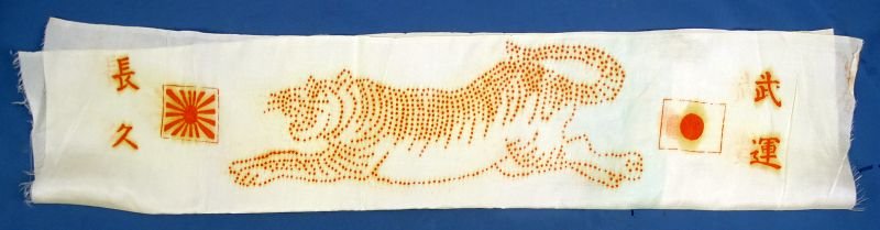 Printed artificial silk, approximately 33 inches long and 12 inches wide, unfolded. The fabric provided the pattern for creating a belt of 1,000 stitches in the image of a tiger, with printed patriotic flags appearing on the ends. Excellent condition.