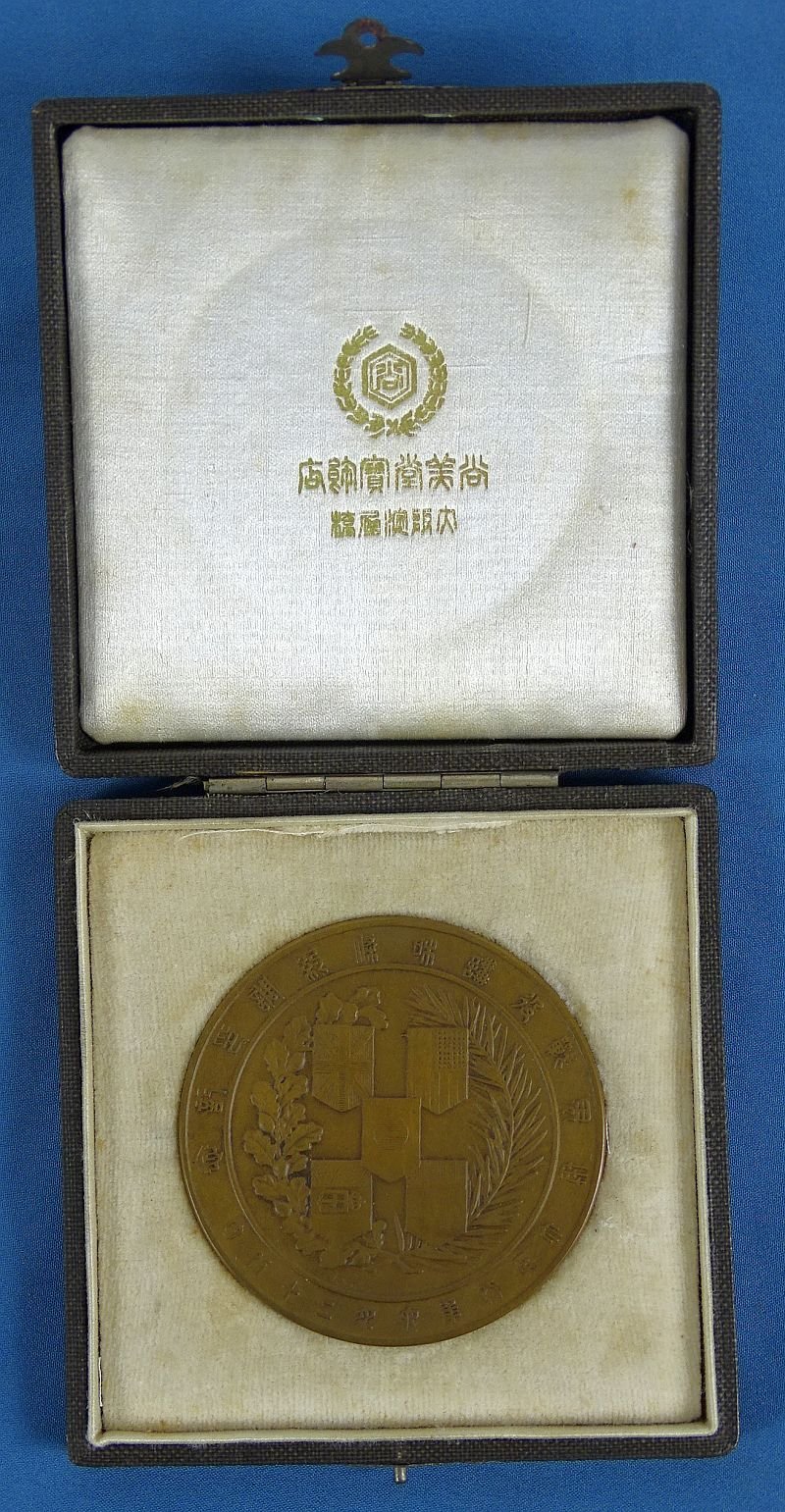 Cased Japanese WWI Victory Commemorative Table Medal. The exterior of the 3 1/2 inch case shows minor scuffing. The bronze medal is dated Taisho 8 (1919), and it measures approximately 2 1/8 inches in diameter. The medal was produced by the Japanese mint and it is in excellent condition.