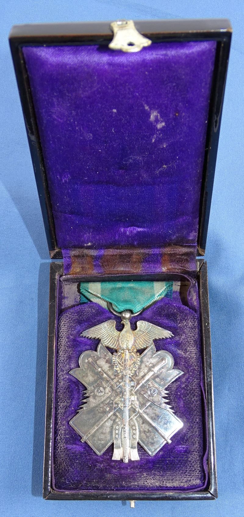 The medal itself shows uncleaned patina. The ribbon shows soiling and some staining from the lining of the case, lacquer case excellent.