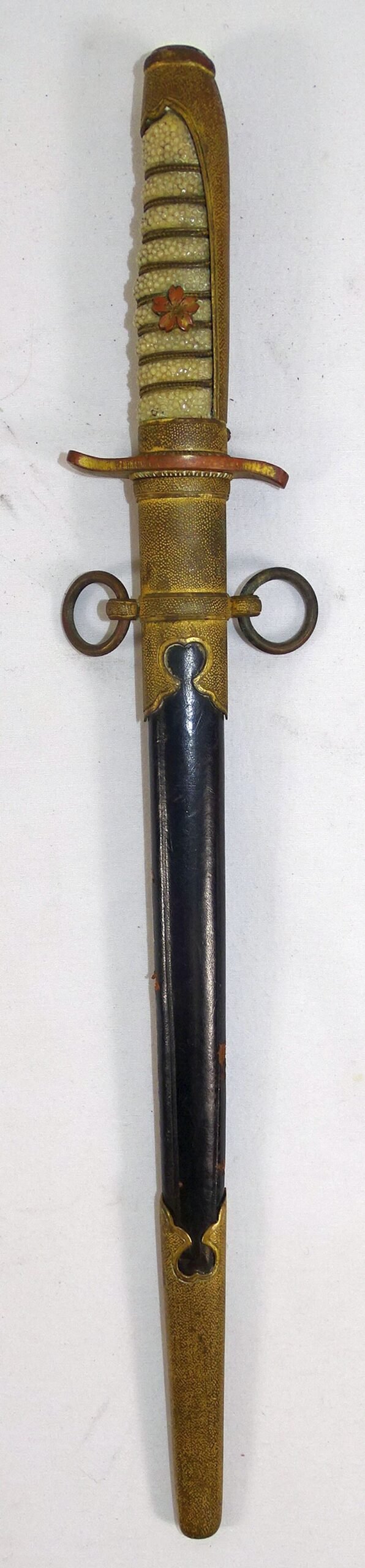 The Forestry dirk the most uncommon of all Japanese dirks. The blade is mostly bright with small areas of surface rust. The shark skin grip is intact with triple wire wrap. The guard, pommel, and scabbard fittings have an uncleaned patina and display much of their gilt finish. The leather scabbard shows scuffs and three small holes in the leather on the sides.