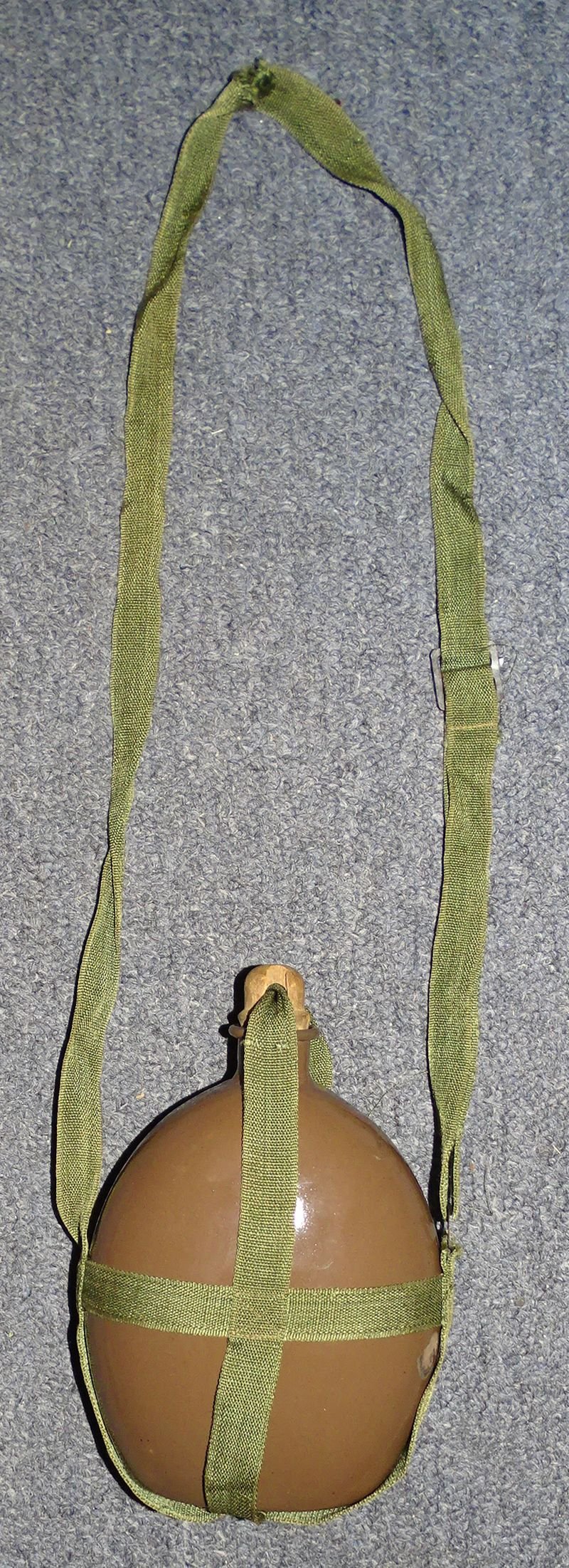 Japanese navy issue canteen, enameled metal with thin late war webbing. Enamel is in excellent condition with no chips, steel rivet on reverse webbing is detached from one strap.