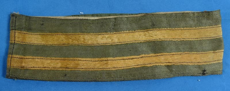 Silk armband with dual sewn horizontal golden stripes. The armband is soiled from wear, with spots, but overall good condition. The cotton interior bears the kanji for 'Military Student Leader 66'.