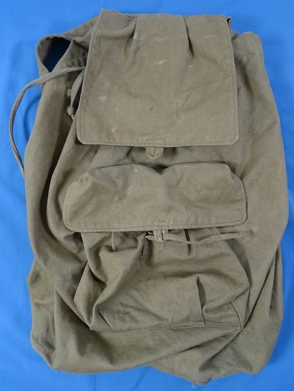 Olive green cotton Navy rucksack in very good condition with some typical spots. As often found on these rucksacks, the issue stamp beneath the flap has been largely inked over.