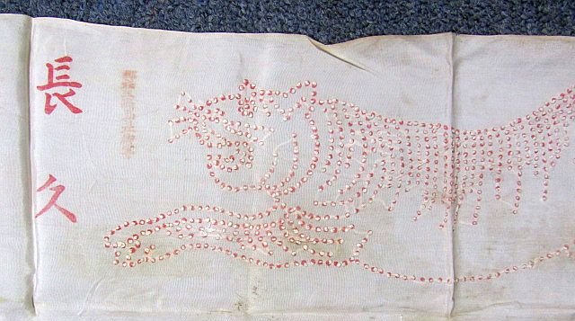 A WWII Japanese belt of 1,000 stitches which were sewn in the form of a tiger on the belt, with printed red kanji flanking the tiger. The belt is artificial silk and is approximately 13 inches wide and 20 inches long (the belt would have been folded horizontally to protect the threads when it was worn). The belt was printed with 1,000 red dots in the design of the tiger, and white knots were then stitched on top of each of those dots to create the belt. Overall excellent condition.