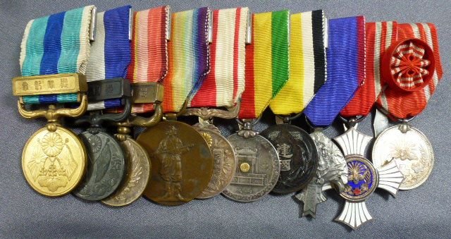 The medal bar contains the following medals and decorations: the Russo-Japanese War Medal; the 1914-1920 War Medal; the Manchurian Incident War Dispatch Medal; the World War I Victory Medal; the Taisho Enthronement Medal; the Showa Enthronement Medal; the 1933 Manchuko National Foundation Merit Medal; the 1934 Manchuko Imperial Visit to Japan Medal; the Japanese Red Cross Merit Decoration in silver; and the Japanese Red Cross Membership Medal in silver, with the rosette which indicates a 'Special Member'. All of the medals and ribbons are in excellent condition. The last medal, the Red Cross membership medal, has lost the hook on the reverse of the ribbon (easily fixed) and it is held in place by the pressure of the medal bar clasp.