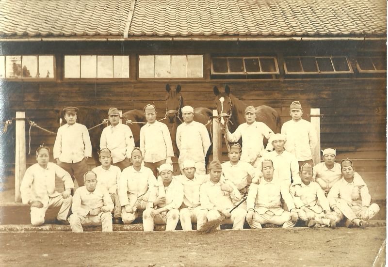 Japanese Soldiers In Fatigue Uniforms & Mechanic Hats, 4″ X 5 3/4″, excellent condition.