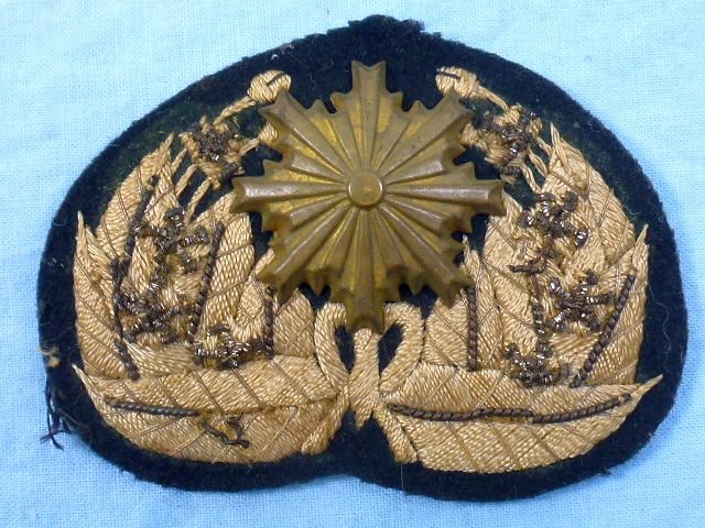 Silk and bullion embroidered cap badge with the gilt star of the police and civil defense forces. 2 inches by 3 inches. Excellent condition.