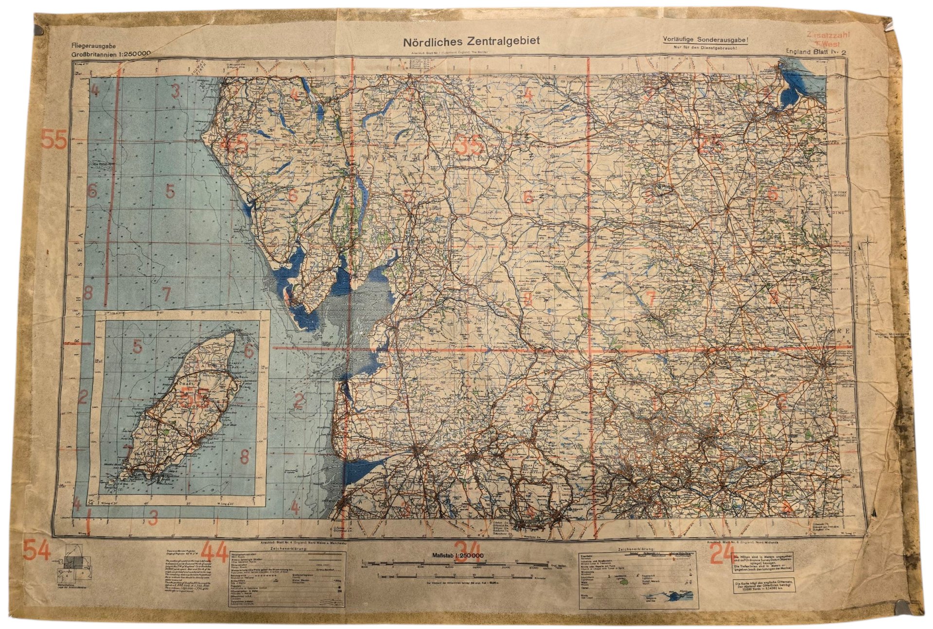 Original WW2 German Luftwaffe Map - Fliegerausgabe Great Britain England Nr. 2, Nördliches Zentralgebiet (1940)Luftwaffe Fliegerausgabe Map of Great Britain, Großbritannien. The backside was laminated during WWII to prevent damaging the map during use. In some parts, the ''plastic'' is coming loose.Originele Wo2 Duitse Luftwaffe Kaart -FliegerausgabeGroßbritannienNr. 2, Nördliches Zentralgebiet (1940)Luftwaffe Fliegerausgabe-kaart van het Verenigd Koninkrijk, Engeland. De achterkant is tijdens de Tweede Wereldoorlog gelamineerd om beschadiging van de kaart tijdens gebruik te voorkomen. Op sommige plaatsen laat het plastic los.