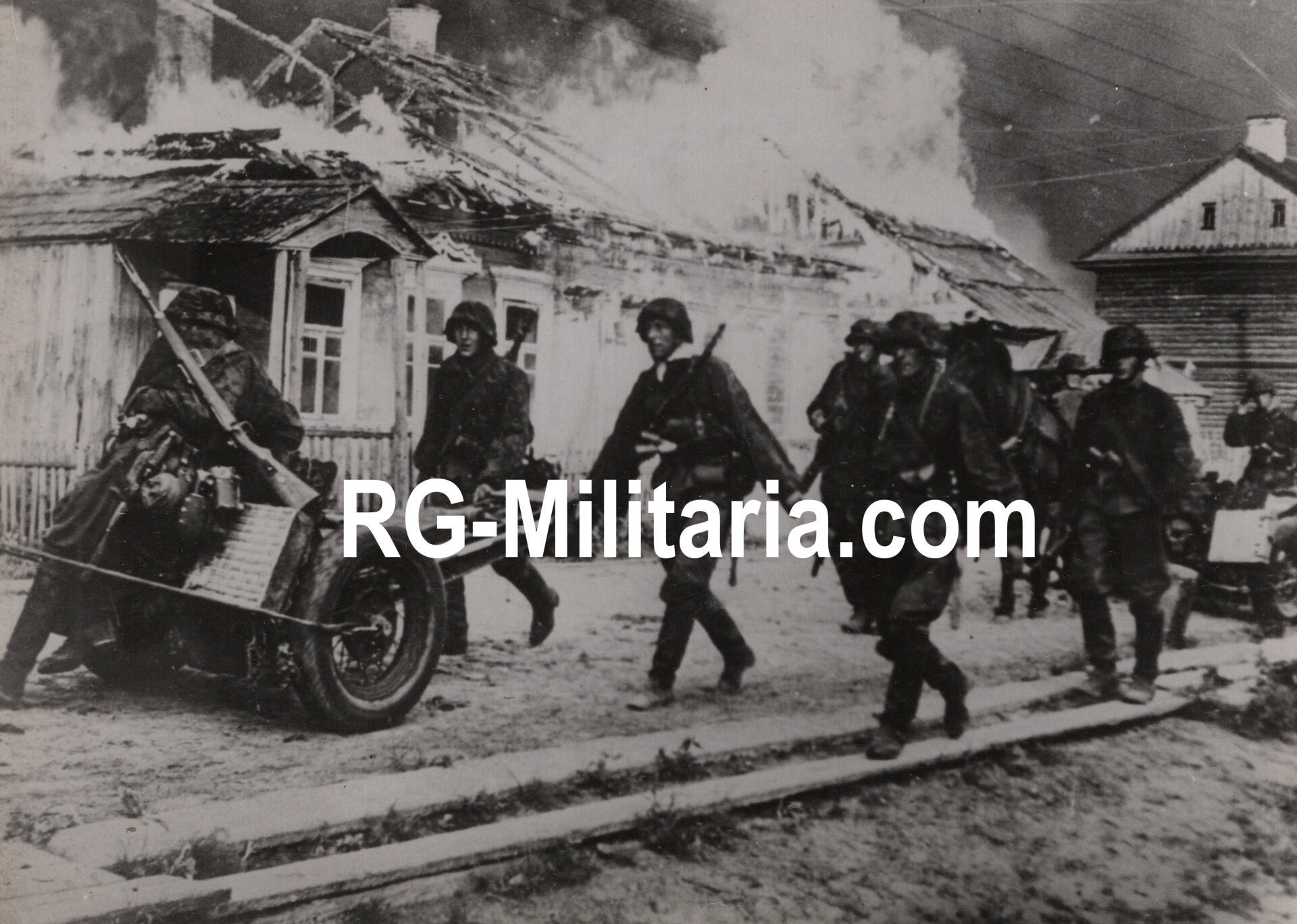 Original WW2 Belgian Waffen SS Press Photo - Waffen SS in a burning Soviet village on the Eastern Front