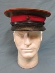 Original era manufacture. A low crown, mustard wool bodied hat, with red wool piping and band. Patent leather visor and adjustable chinstrap, single gilded brass star at front. Dark purple silk lining with an oilcloth sweatband decorated with a thin white silk ribbon. There is some minor scattered mothing to be seen, really nothing to speak of, and overall there is light general wear and use. These early pattern hats are much shorter in height than the later WWII models.