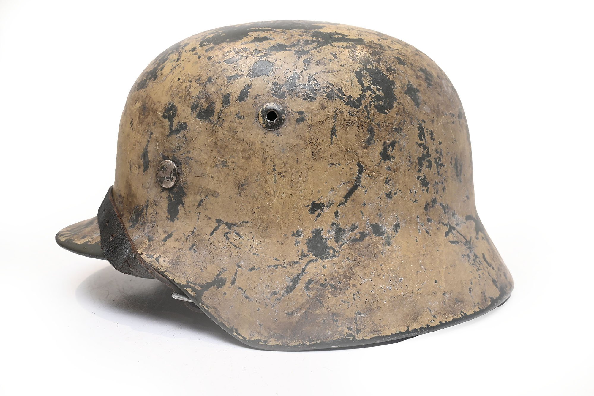 very nice m35 dd wehrmacht sudfront camo helmet.nice dome stamp inside the helmet. 2 decals are present under the yellow sudfront camo.leather is still in great condition an the chinstrao is nice marked.great early war helmet with a nice camo.