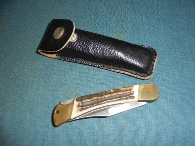 These are a scarce knife with a 3.75' clipped blade etched 910 PUMA PRINCE NEW STAINLESS SUPER KEEN CUTTING STEEL HANDMADE GERMANY, plus a Rockwell stampThe knife is 8.75' overall with brass bolsters and stag horn grips with the release catch stamped 12871, and the knife has its original black leather pouch (Button rusty) S/n 03168Price includes UK delivery