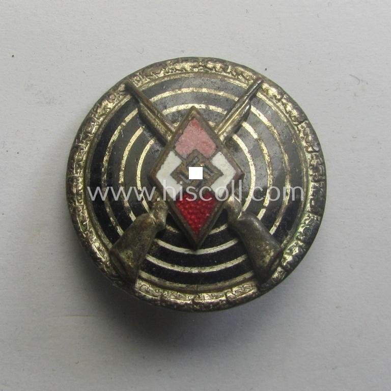 This is a very attractive and fully undamaged(!) - I deem early- (ie. even pre-war-) period example of a HJ ('Hitlerjugend') so-called: 'HJ-Schiessauszeichnung für Scharfschützen' (or: HJ shooting- ie. marksmans'-badge with oakleaf-wreath) being a nicely maker- (ie. 'RzM - M1/63'-) marked example that comes in an overall nice- (I deem surely issued- and/or just moderately worn-), condition. The smaller-sized badge (which is equally sized as an N.S.D.A.P.-membership lapel-pin) is as stated above, neatly marked on the back with the makers'-designation 'RzM - M1/63' as mentioned above. The lapel-pin was never cleaned (some age ie. staining is present) but the piece truly shows no enamel-damage whatsoever (it was most certainly never cleaned nor polished and shows a somewhat tarnished, typical silver-coloured finish). The badge comes naturally mounted onto its fully functional (and unaltered) pin- ie. pin-catch set-up. The piece originates from a German private-household where it was recently found and was never before part of any collection. Simply a neat - and actually not that often seen! - youth-related marksmans'-badge: hard to find a better and more nicely preserved example for a more interesting price!