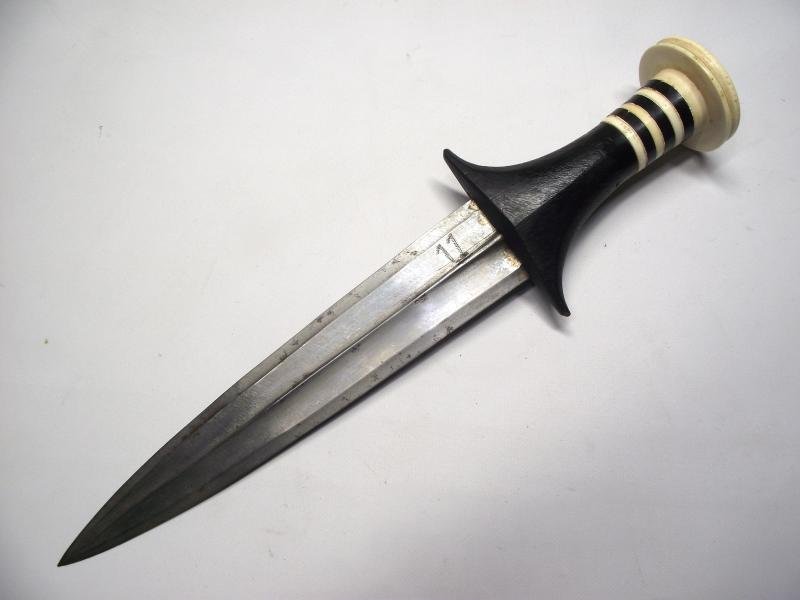 Early 20c' arm dagger with a very nice blade and a good wooden handle. The blade has minimal staining with the number 11 on one side and what looks like a British name scratched into the blade on the other. Some rings have snapped in the handle most probably down to shrinkage. Total length from tip to top of pommel is 12 inches. No scabbard. With the name scratched on one side it would not surprise me if this was brought back by a British veteran of the ''Battle of Omdurman'', thats a guess only folks!NOT FOR SALE TO UNDER 18'S AND UK ONLY. PROOF OF AGE WILL BE REQUIRED!