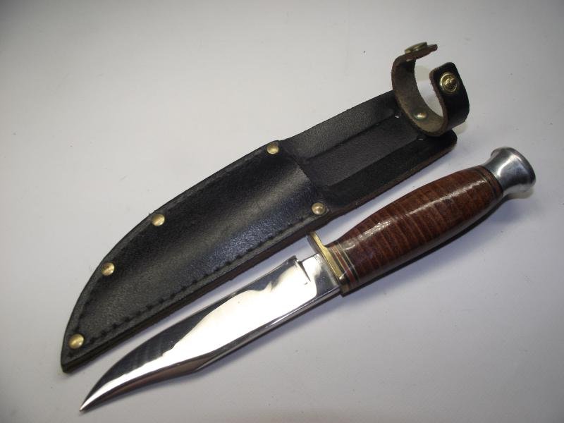 A very nice condition vintage knife with ''Slater'' stamped blade having all its bright finish with some minor scratches and a light sharpening to the cutting edge. Leather stacked grip is in perfect condition. Comes with its period leather scabbard.NOT FOR SALE TO UNDER 18'S AND UK ONLY. PROOF OF AGE WILL BE REQUIRED!