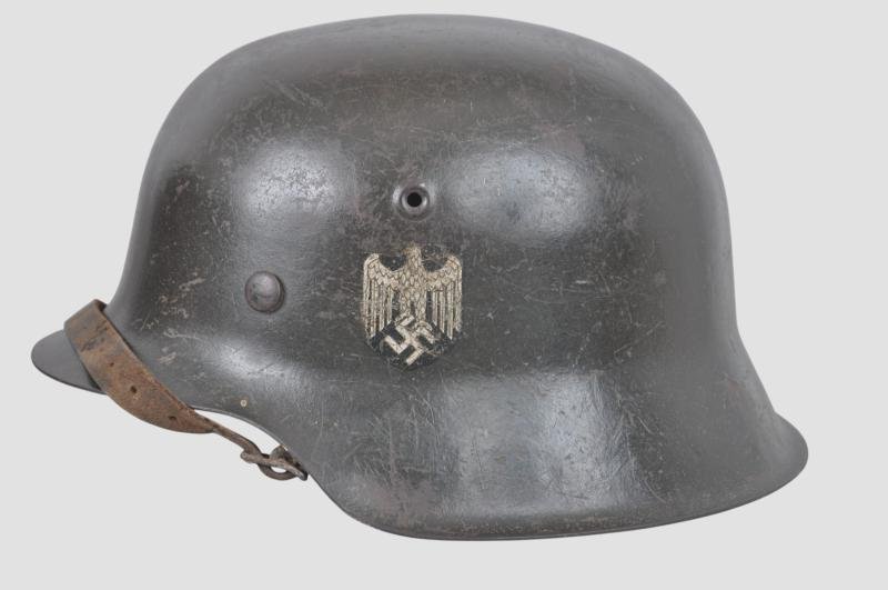 An untouched M42 single decal army helmet complete with its original chinstrap.This classic German combat helmet has the ET army decal with smooth right wing tip & dimpled talon. The shell has a very large percentage of its dark grey finish remaining showing minor scuffs & wear indicative of combat wear. Decal approx 85% intact.Underside of shell has faint markings to rear of skirt these apparently a faint 'CKL' mark ( ET) & size 64. Lot number '3035' . Liner retains its original tightening cord . Leather chinstrap has never been off of the helmet this having grey painted steel buckle & faintly marked pointed end.