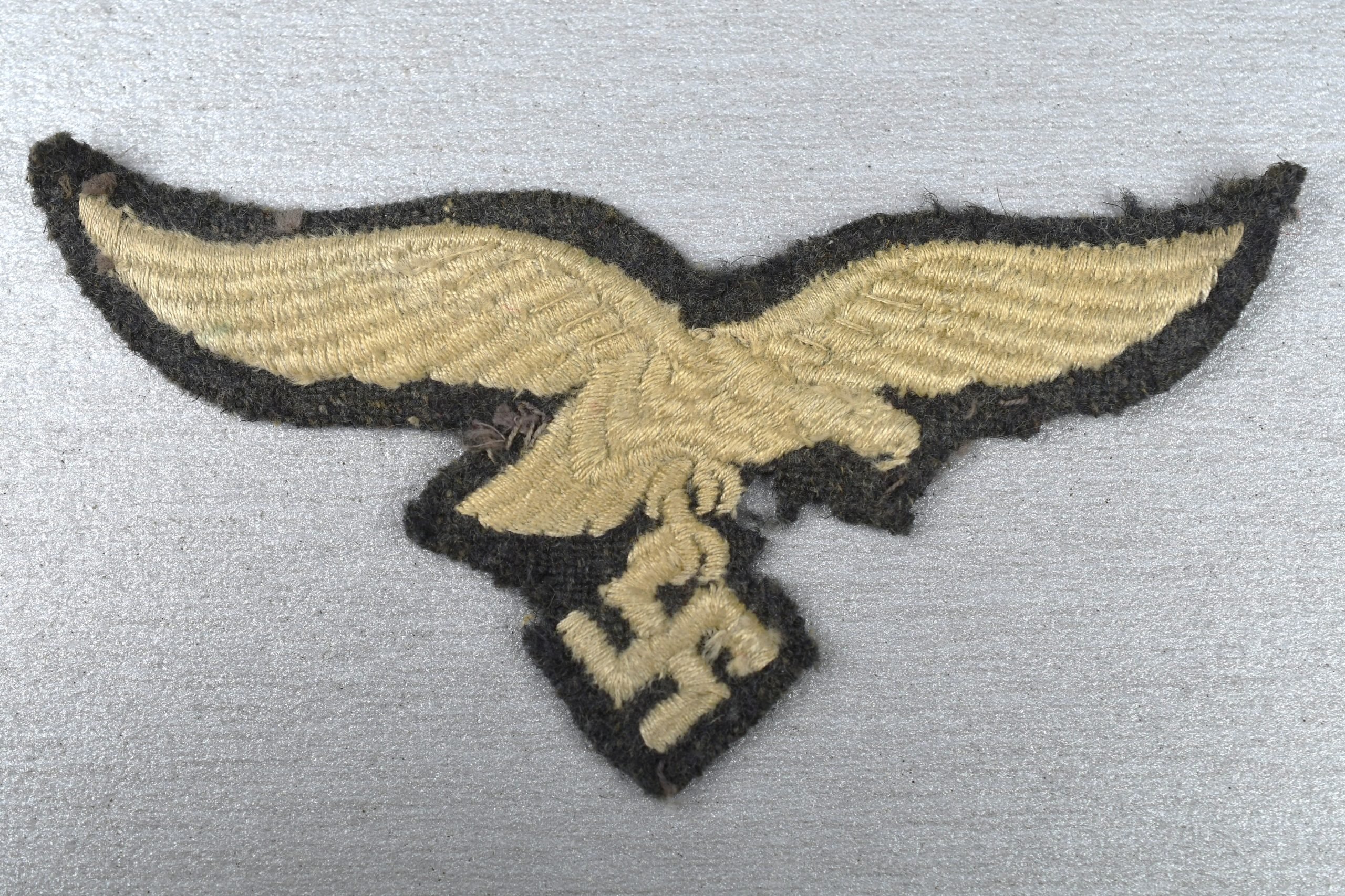 Standard Luftwaffe breast eagle. Machine embroidered eagle in white thread on blue felt. Textbook example, to be worn on a Luftwaffe fliegerbluse.
