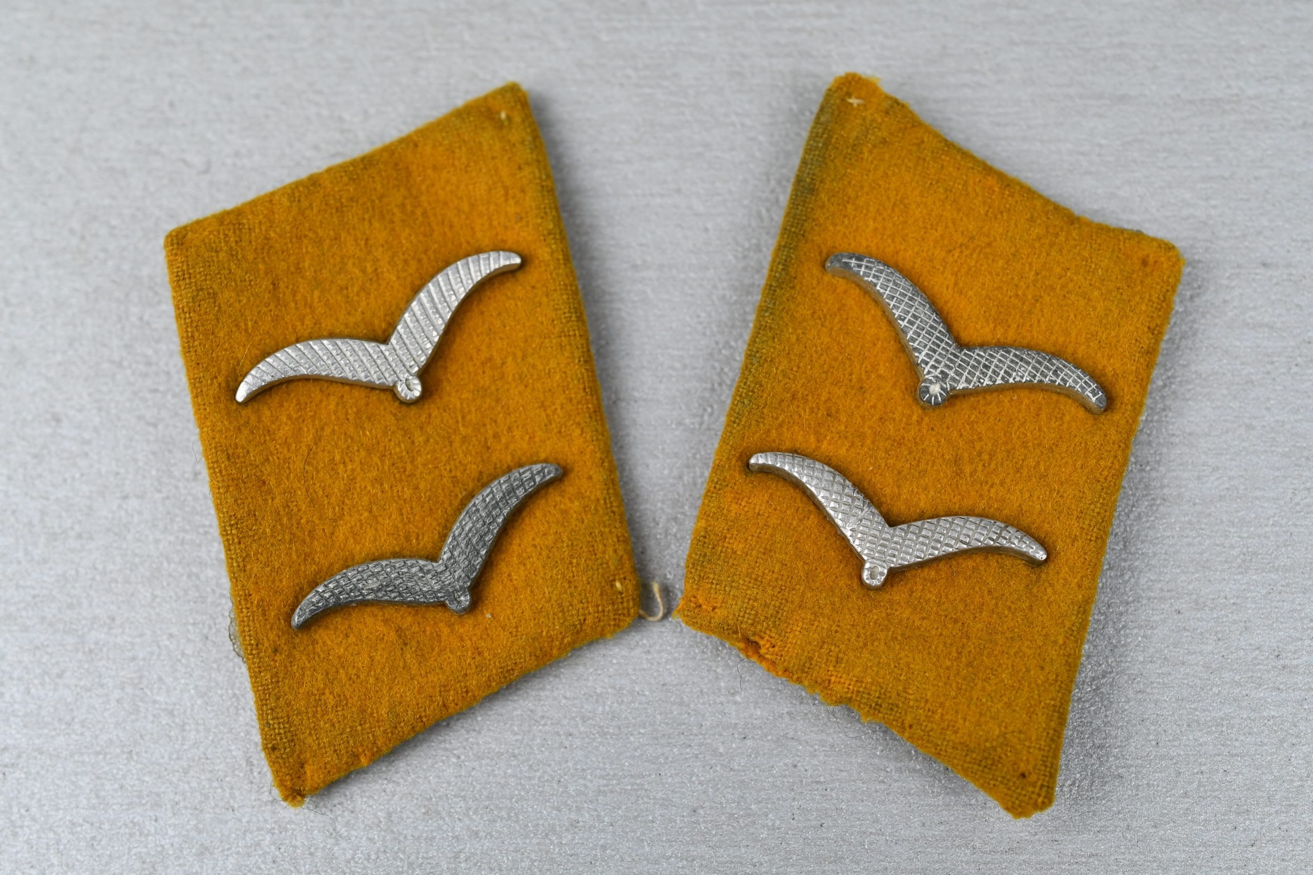 Worn set of enlisted Luftwaffe collar tabs. Yellow colored for a member of a 'Flieger' unit – that could either be a pilot or a paratrooper (Fallschirmjäger). Light worn set with three rank guls for either Gefreiter in enlisted ranks or UnterFeldwebel in NCO ranks.