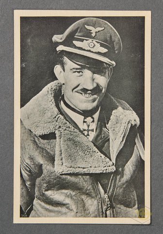 German WWII Postcard of General Adolf Galland-This is not a signed postcard, but it is a nice black and white postcard of Galland. This black and white postcard measures 5 ½ inches (13.97cm) tall, and 3 ½ inches (8.89cm) wide. The reverse of the post card is setup in the traditional postcard style, with a caption in German. This postcard is in very good condition.Bio:Galland-Adolf Josef Ferdinand Galland was born in 1912 and died in 1996. He was a German Luftwaffe general and flying ace who served throughout World War 2 in Europe. He flew 705 combat missions and fought on the Western Front and in the defense of the Reich. On four occasions, he survived being shot down, and he was credited with 104 aerial victories, all of them against the Western Allies. He was born in Westerholt, Westphalia became a glider pilot at age 17. In 1932, he graduated as a pilot at the Deutsche Verkehrsfliegerschule (German Commercial Flyers' School) in Braunschweig before applying to join the Reichswehr of the Weimar Republic later in the year. Galland's application was accepted, but he never took up the offer. In February 1934, he was transferred to the Luftwaffe. In 1937, during the Spanish Civil War, he volunteered for the Condor Legion and flew ground attack missions in support of the Nationalists under Francisco Franco. After finishing his tour in 1938 Galland was employed in the Air Ministry writing doctrinal and technical manuals about his experiences as a ground-attack pilot. During this period Galland served as an instructor for ground-attack units. During the German invasion of Poland in September 1939, he again flew ground attack missions. In early 1940, Galland managed to persuade his superiors to allow him to become a fighter pilot.